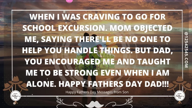 When I was craving to go for school excursion. Mom objected me, saying there'll be no one to help you handle things. But Dad, You encouraged me and taught me to be strong even when I am alone. Happy Fathers Day Dad!!!